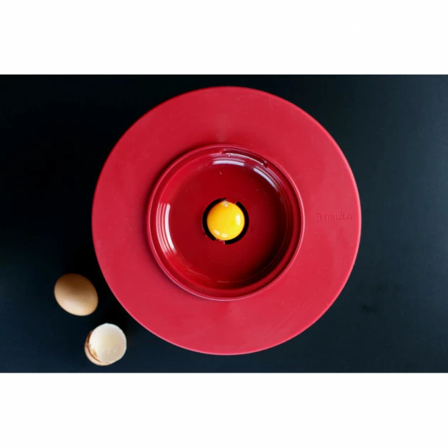 Pour utiliser le séparateur d’oeuf, il suffit de le poser sur le couvercle rouge. Versez l’oeuf dedans : le jaune reste dans le séparateur tandis que le blanc d’oeuf tombera dans le bol inox 5 en 1 Terraillon. Vous pourrez directement battre les blancs pour réaliser une meringue ou une île flottante !