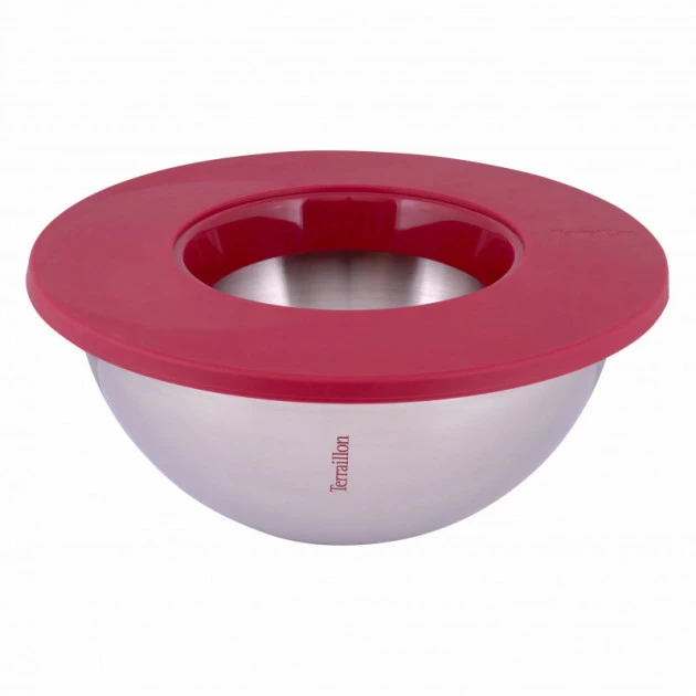 Le large couvercle rouge possède deux fonctions : posé à l’endroit et sur le bol inox Terraillon, il protège des éclaboussures. Par contre, s’il est posé à l’envers et sous le cul de poule, il empêche ce dernier de glisser. Ainsi, vous pourrez monter vos blancs d’oeufs en neige sans mal ou préparer une ganache au chocolat.